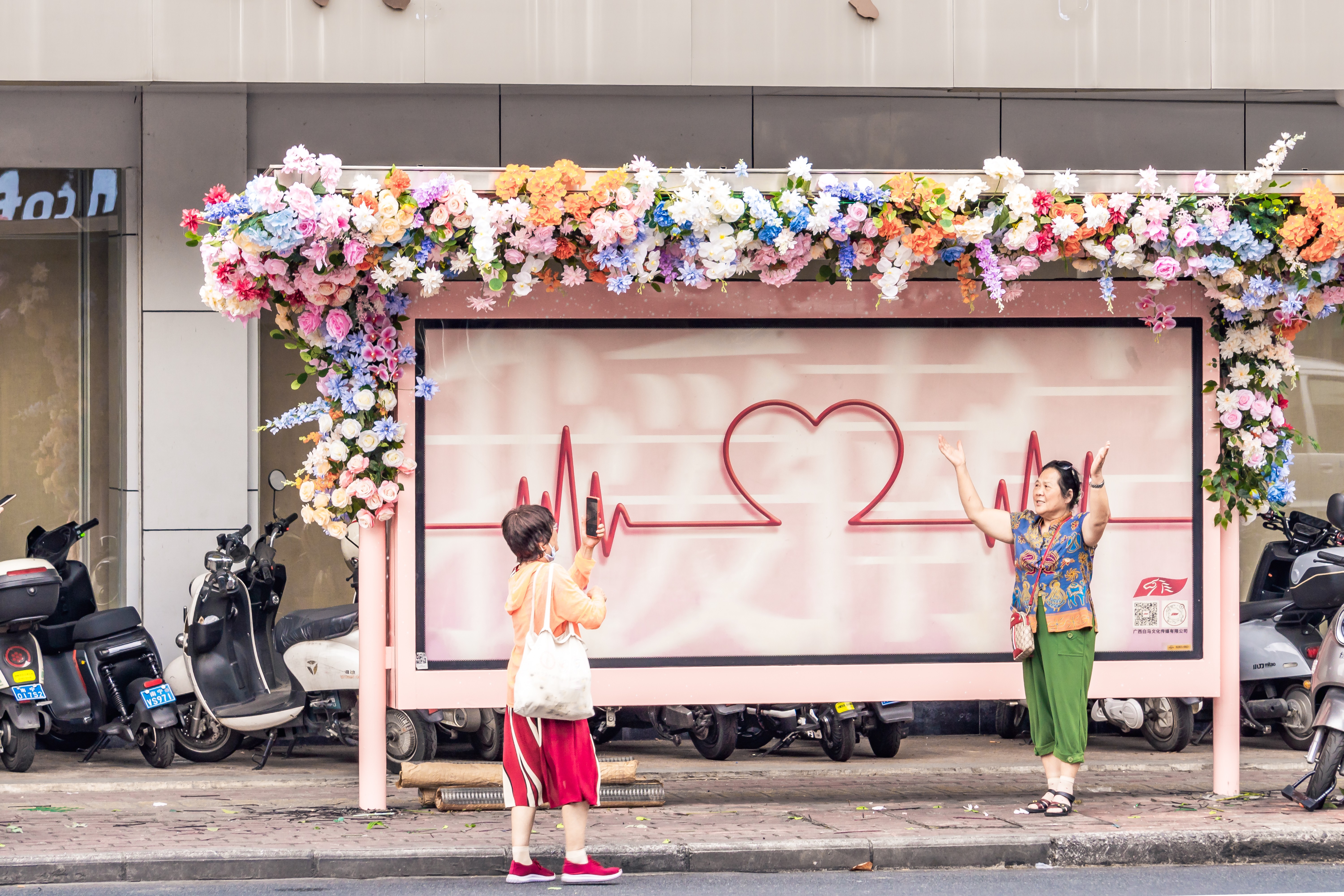 繁花裝扮的公交候車亭采用了絢麗多彩的花卉設(shè)計(jì),讓原本普通的候車亭煥然一新,成為南寧街頭一道亮麗的風(fēng)景線,受到了眾多市民的認(rèn)可和喜愛,也成為市民520的打卡地。路人紛紛駐足欣賞,更有許多年輕人專程前往打卡拍照,感受南寧的浪漫與美好。