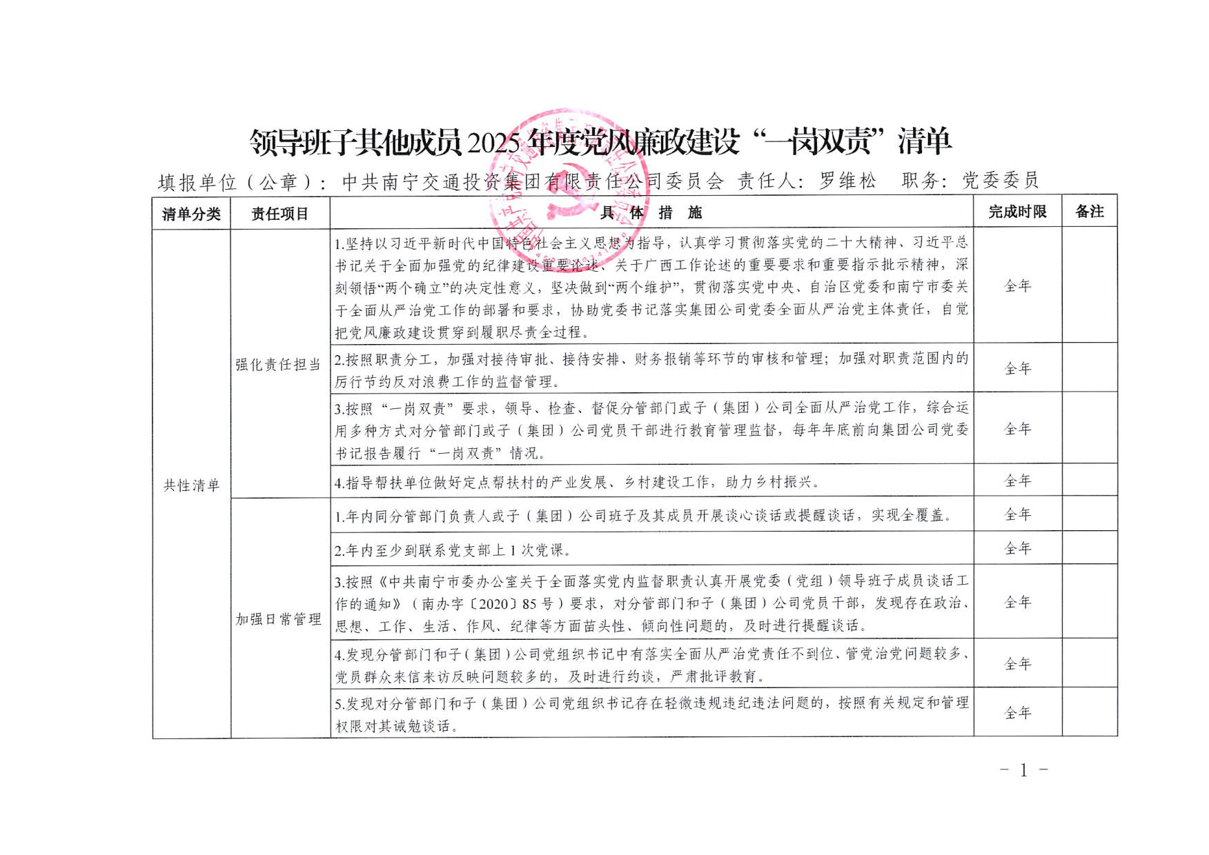 南寧交投集團領(lǐng)導(dǎo)班子其他成員2025年度黨風廉政建設(shè)“一崗雙責”清單(五)