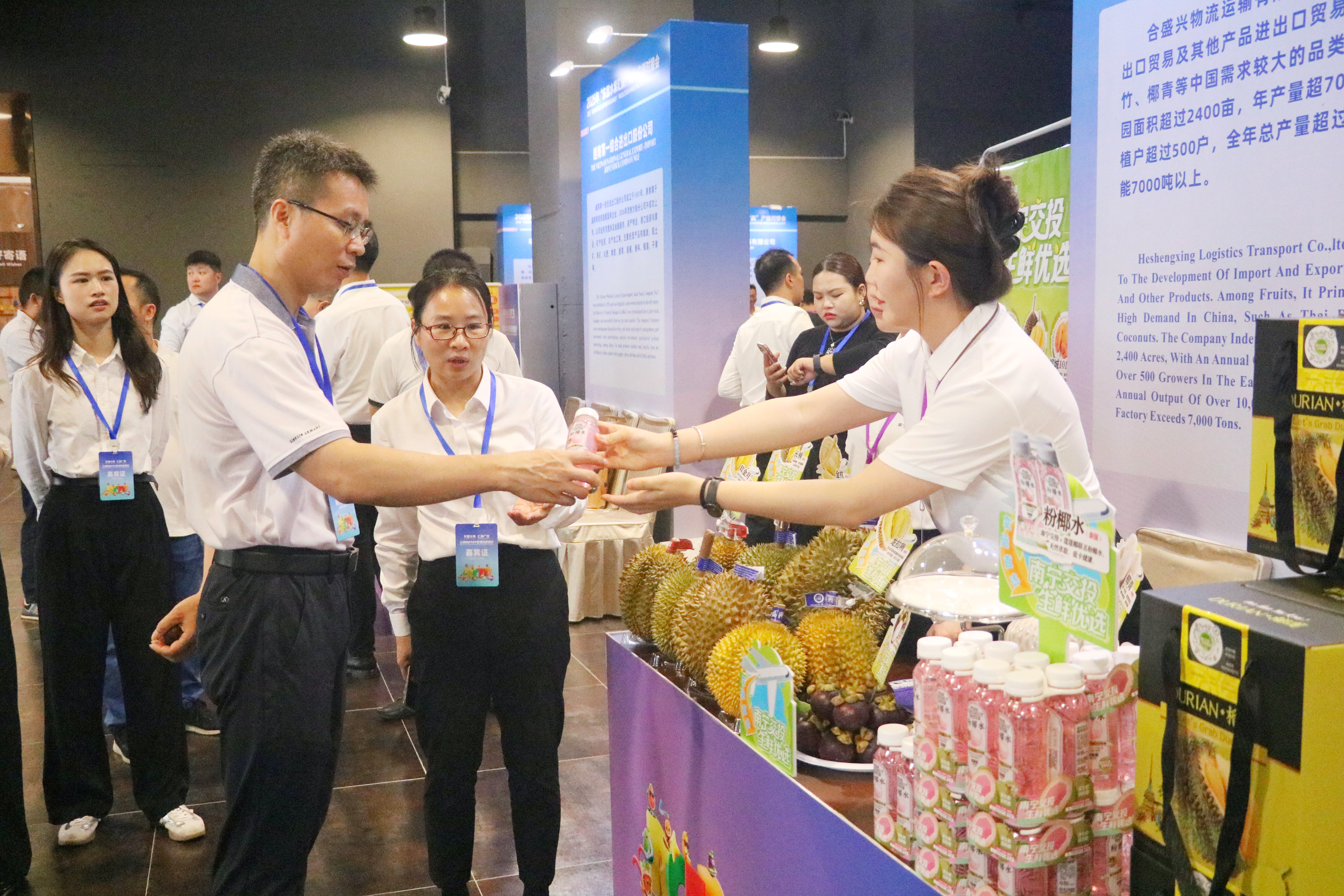 這次參展,南寧交投集團帶來了豐富多樣的優(yōu)質(zhì)產(chǎn)品。產(chǎn)自馬來西亞的黑刺、貓山王、紅蝦榴蓮,以及菲律賓黃金普雅榴蓮、越南干堯榴蓮、山竹等優(yōu)質(zhì)水果紛紛亮相。由南寧交投集團與蔻蔻椰聯(lián)名推出的椰子水,憑借獨特風(fēng)味和品牌效應(yīng),吸引了眾多客商駐足關(guān)注?,F(xiàn)場還同步開啟直播,短短幾小時內(nèi),直播流量突破200多人次,吸引大量線上觀眾。據(jù)初步統(tǒng)計,4個主要展位的客流量合計達到近千人,現(xiàn)場人氣十分火爆。